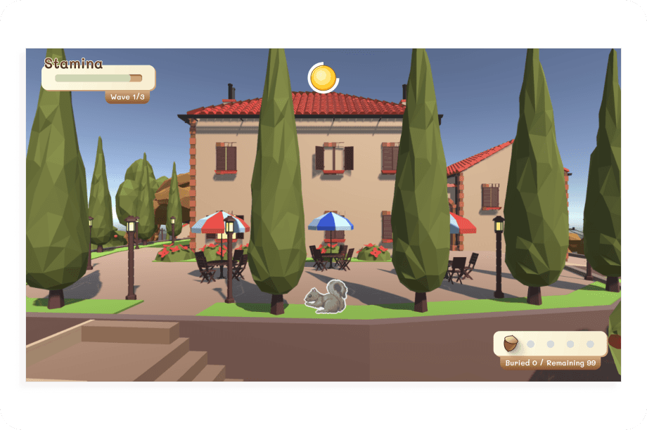 I focused on balancing gameplay loops, difficulty progression, and rewarding player engagement. The result was an enjoyable yet challenging experience centred around a squirrel gathering acorns to survive an incoming storm.