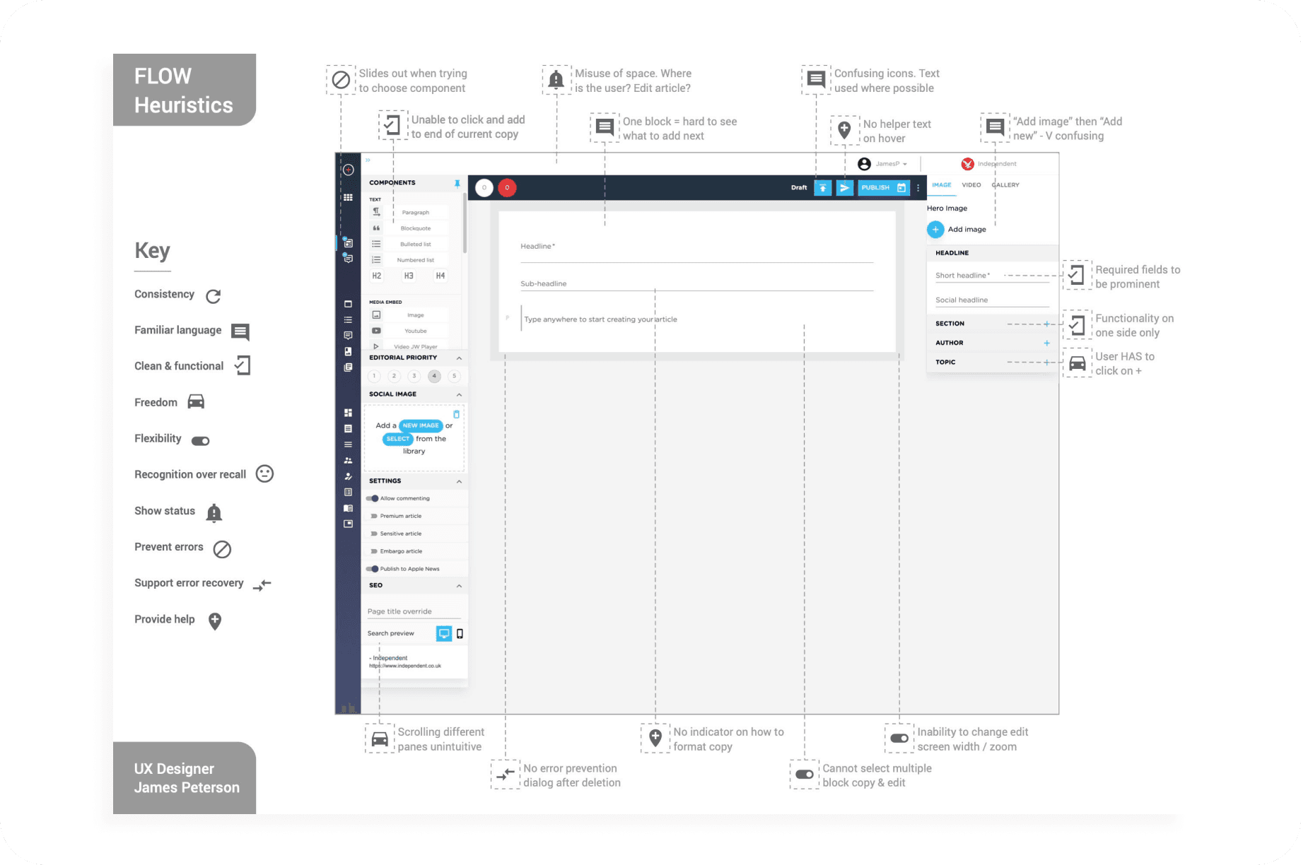 I undertook early heuristics reviews of all major screens and journeys. This allowed the FLOW development team to catch any major concerns before it got in to the hands of our journalists.