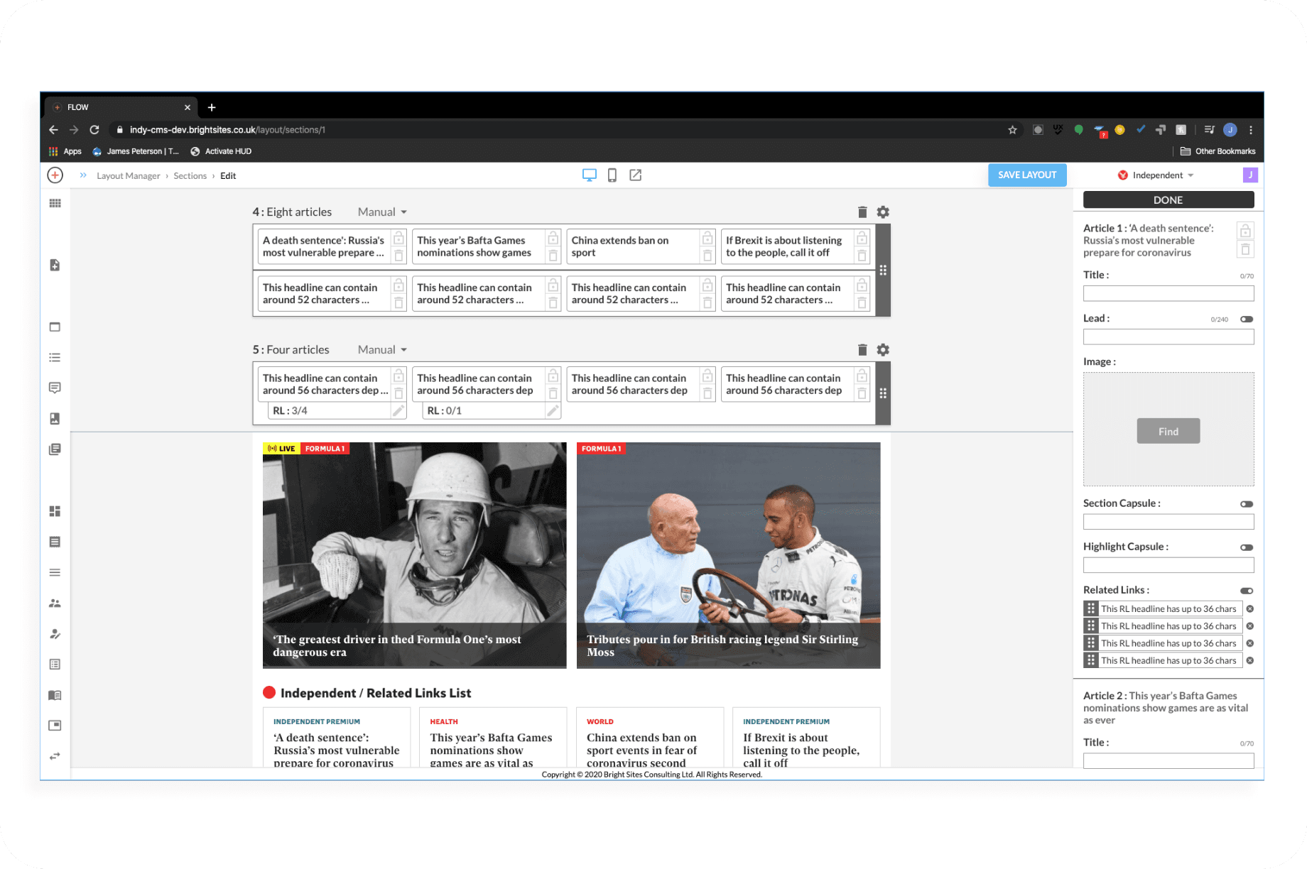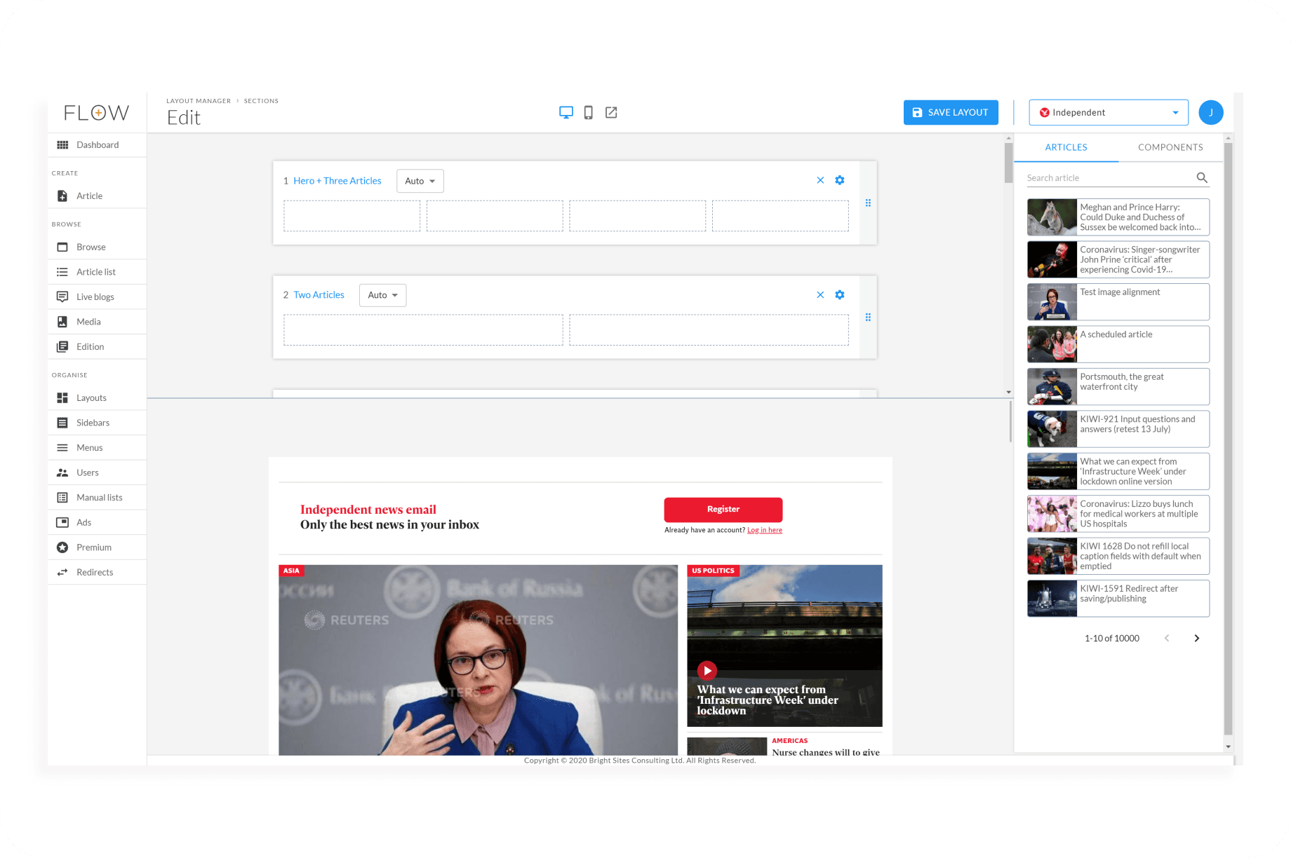 A new part of the FLOW CMS being built exclusively for ESI Media was the home page layout manager. I led the design of this key screen, working closely with senior editors to understand how they would like to visualise this experience.