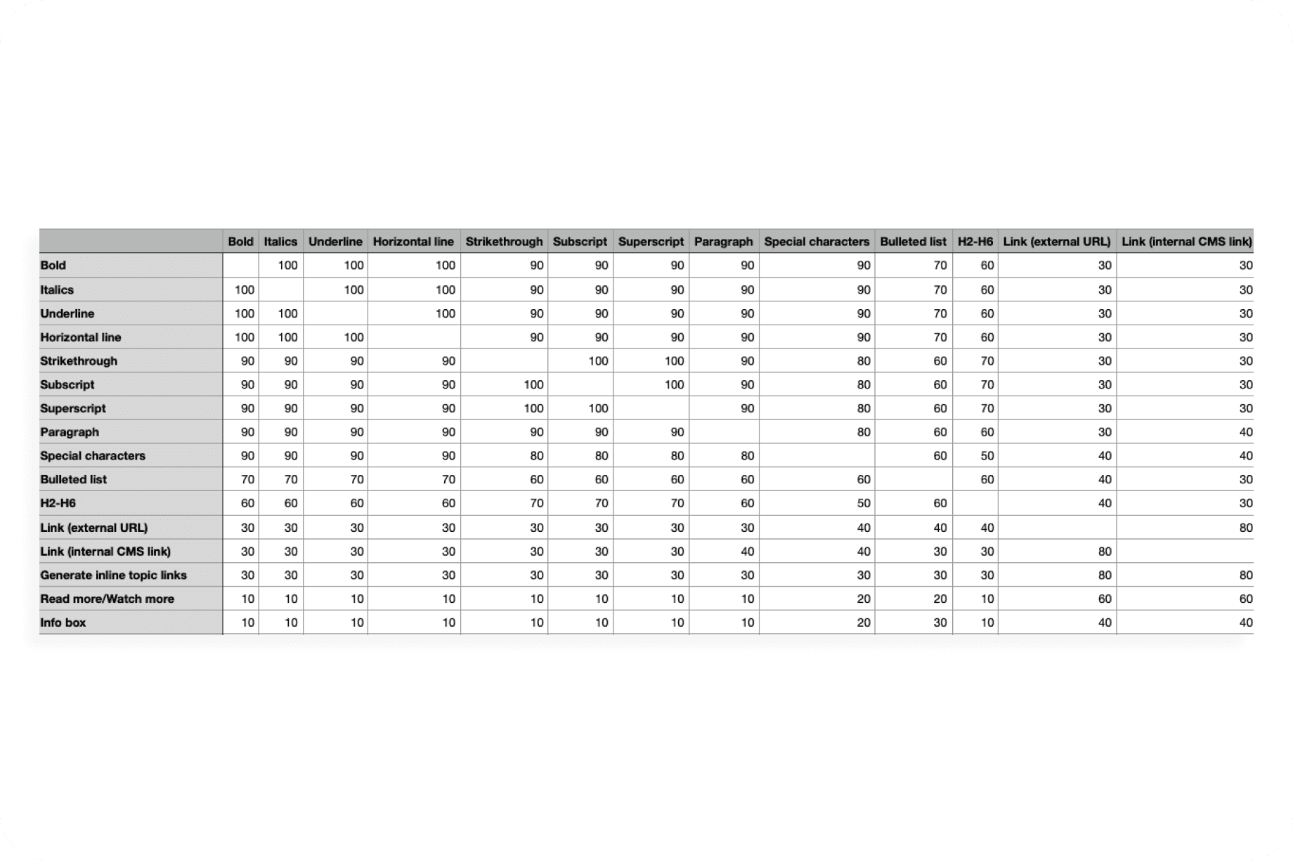 I knew that one of the key journeys of a journalist is to actually create an article within the CMS. To ensure they were comfortable doing this directly in the platform, instead of using a less secure platform such as Google Docs, I ran a card sorting exercise to ensure all of the most important formatting options were grouped intuitively. Below you can see the results of that data.