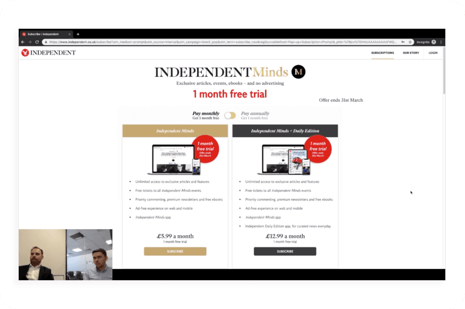 I was tasked with providing expert UX recommendations and to run a conversion rate optimisation programme. Responsibilities included introducing a suite of new subscription touchpoints, including pop-ups, banners and selling pages.