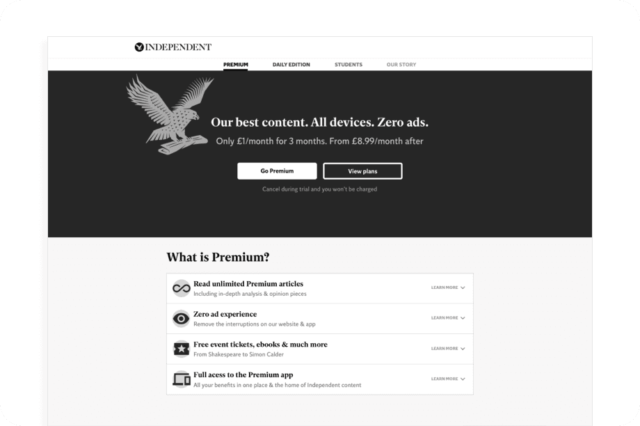 The Independent newspaper was transitioning from a completely ad-based revenue model to one that is supplemented with a new subscription product called Independent Premium.